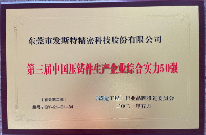 2021年6月,东莞市发斯特精密科技股份有限公司在由中国铸造协会会刊《铸造工程》杂志社主办,香港铸造业总会、广东省铸造行业协会等共同协办的第三届“中国压铸件生产企业综合实力50强(简称中国压铸50强)的评选活动中,喜获“中国压铸50强“的荣誉称号。